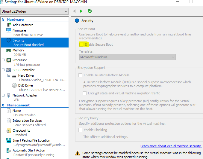 Prima di far partire la macchina virtuale disattiviamo il safe boot: