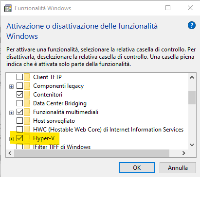 Dopo aver attivato la virtualizzazione da BIOS, il passaggio più scomodo, serve spuntare la cartella Hyper-V dal programma Attiva o disattiva funzionalità di Windows, che puoi cercare da start o da pannello di controllo
