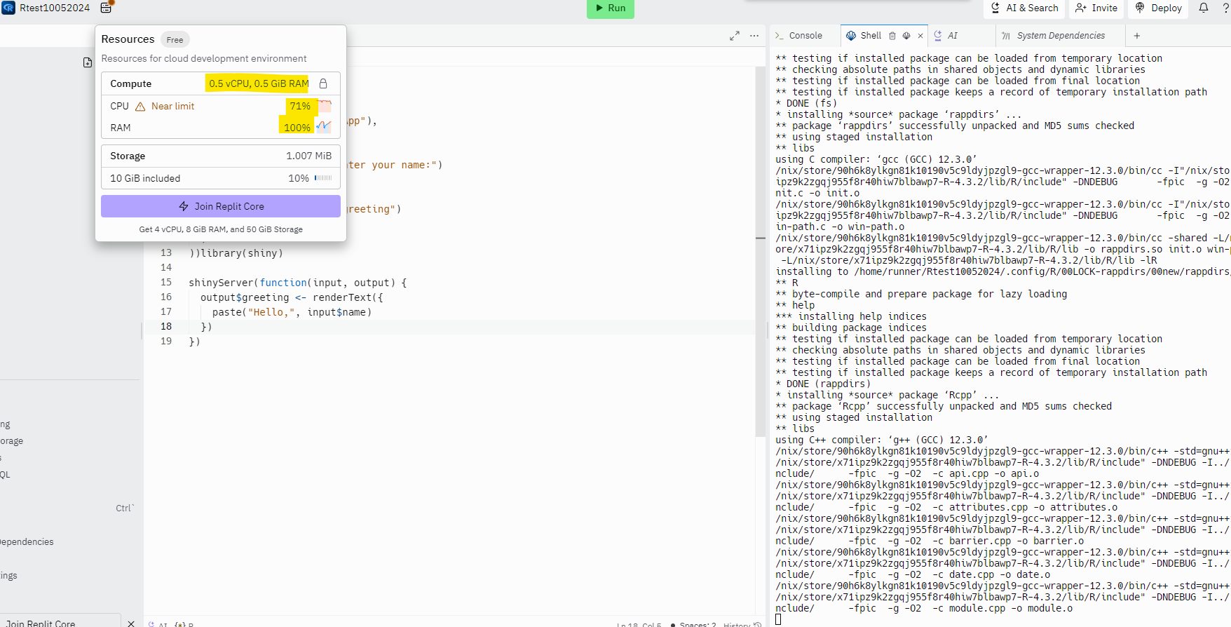 Cosa succede se prendi l’opzione più economica? Ho tentato di replicarla su Replit, un banco di lavoro per codice remoto, dove abbiamo però metà CPU virtuale (0,5 vCPU):