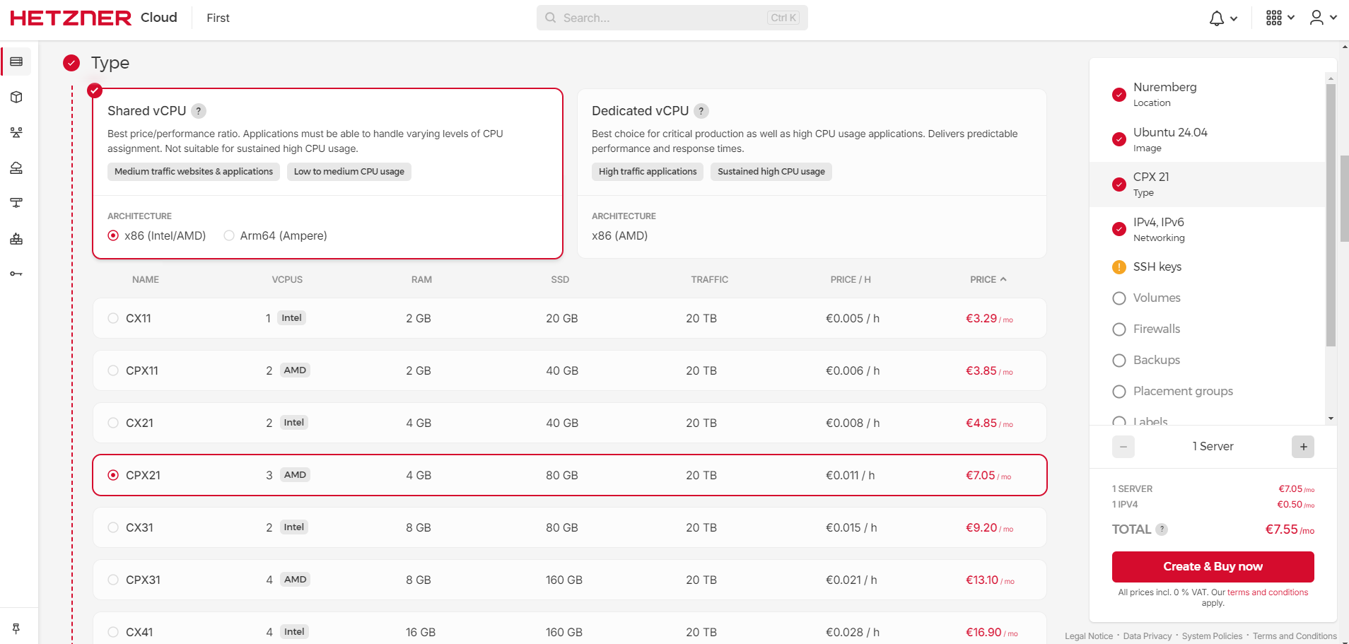 Su Hetzner possiamo avere un server virtuale privato (VPS), parola a mio avviso confondente, che comunque indica una frazione di computer virtuale di terzi. Quando andiamo ad aggiungere un server ad un progetto, in “type” troviamo quanto segue: